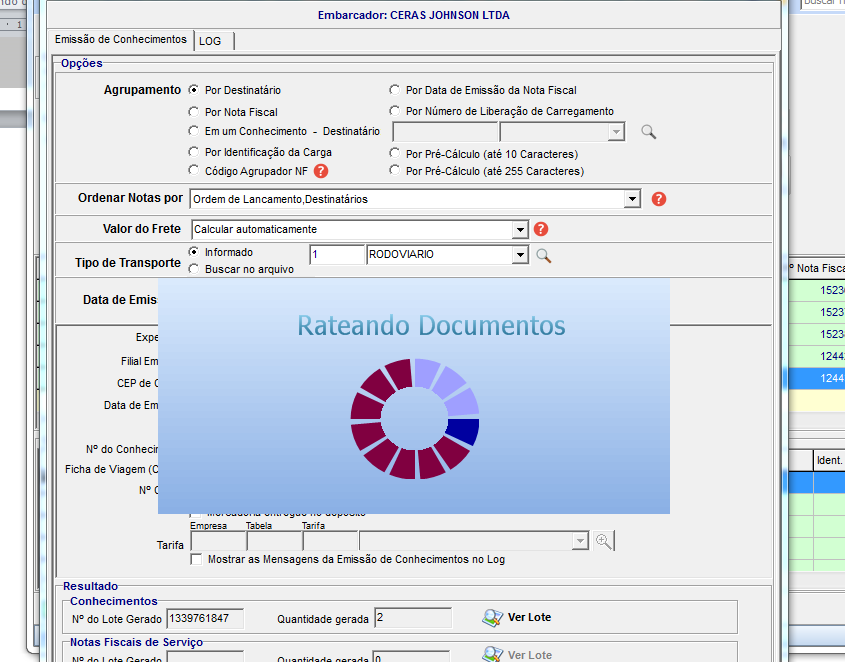 Se alterado o tipo de transporte do cadastro da vinculação de rateio e gerar o lote com as mesmas notas do exemplo anterior. De acordo com o mesmo tipo de transporte, o sistema localiza a vinculação e gera o rateio corretamente: