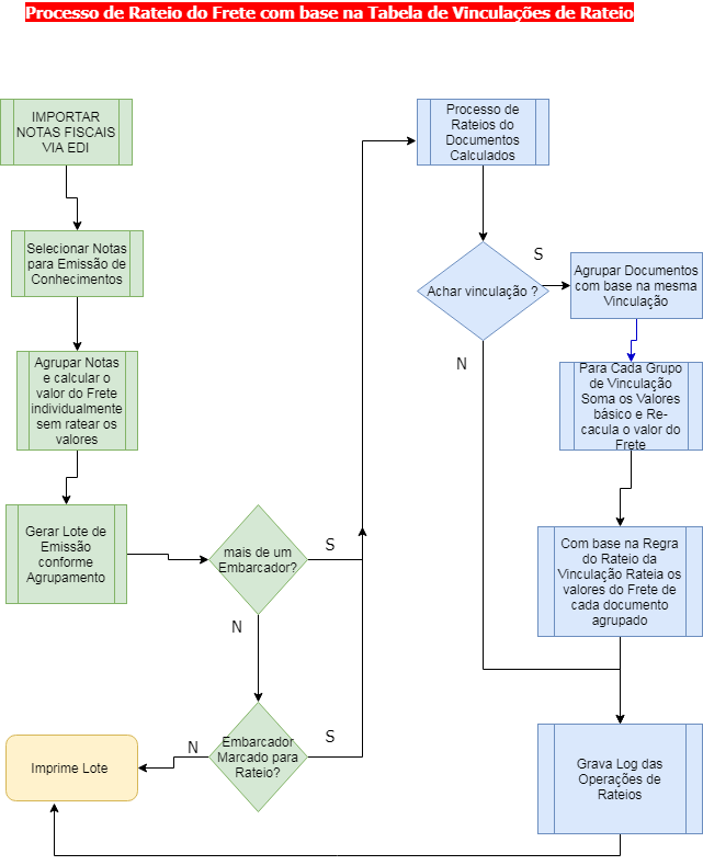 Se existirem dois Embarcadores (Remetentes da Cargas) diferente dentro do Lote ou Se o Embarcador(Remetente da Cargas) estiver configurado para “Verifica vinculação de Rateio”, a rotina irá disparar o processo para identificar se existe alguma vinculação de Rateio com base nas combinações dos documentos criado dentro do Lote. Se esse pré-requisito for atendido, então a segunda fase do processo será acionado, re-compondo os valores o Cálculo do Frete com base na soma de Todos os Documentos relacionados e efetuado o rateio dos valores conforme os critérios estabelecidos na regra da Tabela de Vinculação de Rateio.