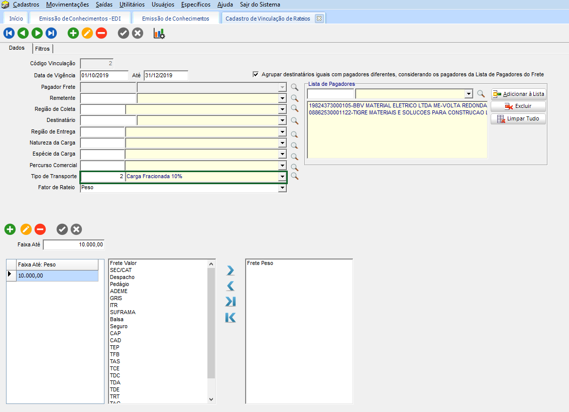 A vinculação de rateio, é o cadastro de regras que determinam quais as características necessárias, para que um conjunto de documentos de CTE, gerados pela emissão de EDI, seja rateado por um determinado fator matemático previamente configurado. Bem como, quais os campos da composição do frete sofrerão incidência do rateio.