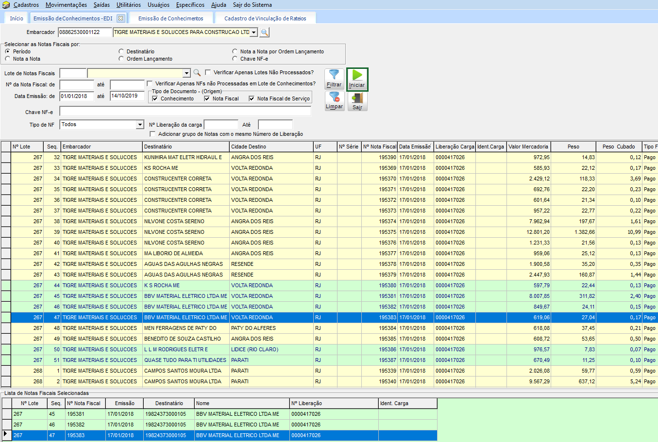 Na tela de Emissão de Conhecimentos via EDI, selecionado três notas fiscais que estejam de acordo com as informações da vinculação e clicar em Iniciar.
