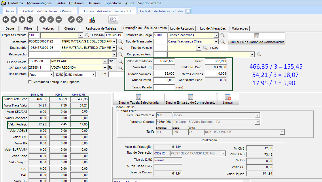 Caso as notas recebidas por EDI, tenham todas essas informações corretas, poderá ser utilizado como exemplo a guia de Simulação de Cálculo de Fretes, da Tabela de Frete (Cadastros > Tabelas de Frete > Tabelas de Frete Pré-Formatadas) para realizar uma simulação do rateio gerado. Neste exemplo foi realizado a soma total das notas para cada campo mencionado que faz parte do cálculo, e gerado a simulação de um único conhecimento. O resultado foi dividido pela quantidade de conhecimentos que deseja gerar.