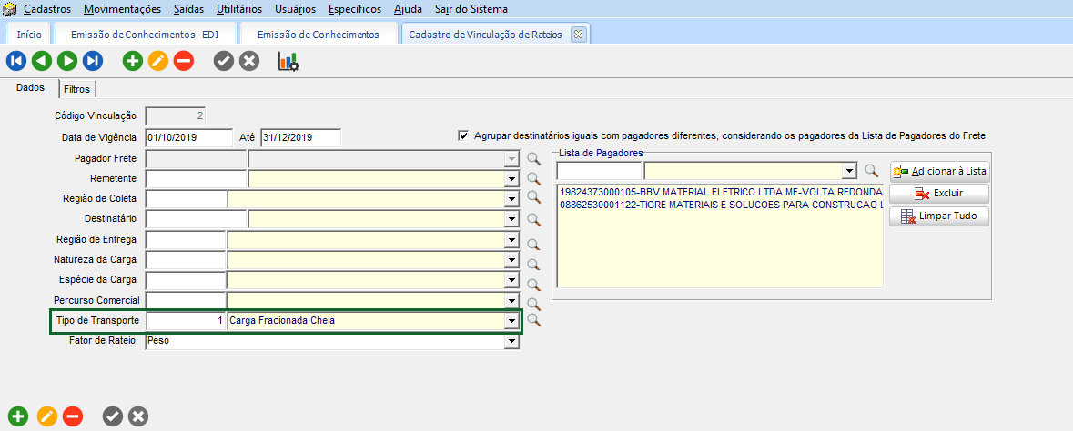 Após realizar as configurações, cadastre uma vinculação de rateio, informando um tipo de transporte: