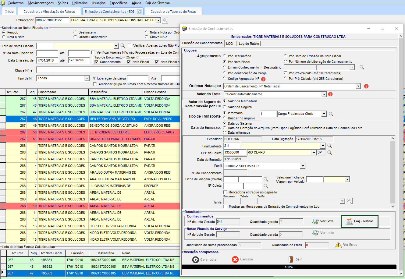 Na tela para gerar o lote, o tipo de transporte selecionado é diferente do que foi informado na vinculação. Clique em Gerar lote e após será habilitado botão Log rateio, clique e verifique que o sistema não encontra nenhuma vinculação durante a geração do lote.