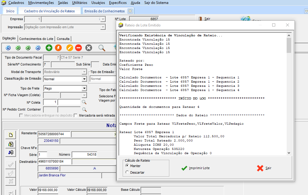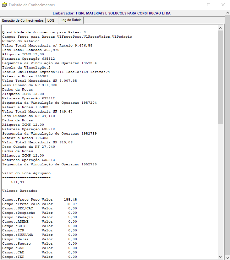 Após marcada configuração e cadastrado uma vinculação de rateio, com mais de um conhecimento cadastrado. Então é possível verificar que o rateio foi realizado em cada um dos conhecimentos vinculados e no log do Rateio gerado na emissão do conhecimento: