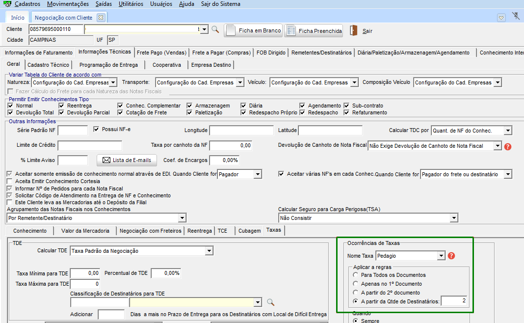 Após configurado, na tela de negociação com cliente, para o pagador do frete dos conhecimentos, selecionado na opção Ocorrências de Taxas, um registro e marcado a opção a partir de dois destinatários (como no exemplo utilizado).