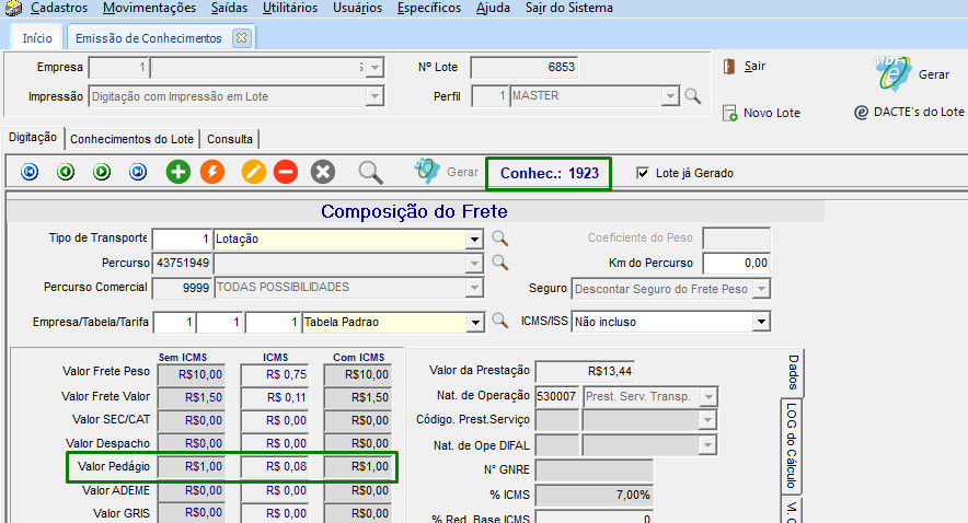 Na tela de emissão do conhecimento, cadastrado 4 documentos no lote, sendo que a taxa de pedágio que foi configurada na negociação, será apresentada somente para a partir do terceiro conhecimento: