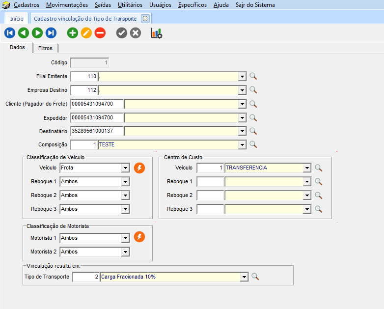 Na tela de cadastro de vinculação de tipos de transporte, poderá ser definido os tipos de transporte para o cálculo das tabelas de frete de acordo com cada situação. Ao emitir um conhecimento, o sistema verifica se existe uma vinculação cadastrada para buscar o tipo de transporte adequado.