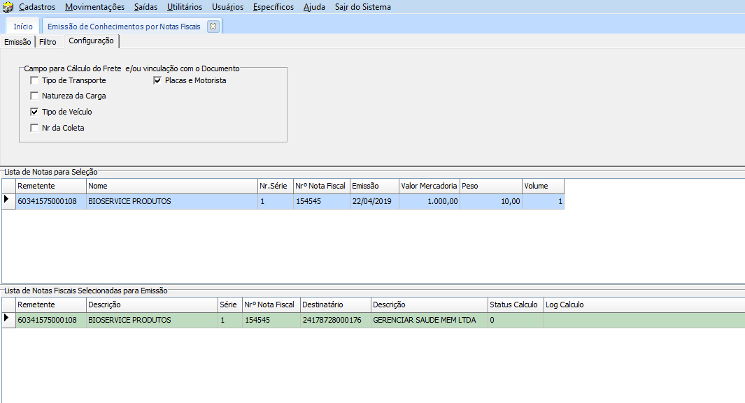 Após realizado o realizado o cadastro de uma vinculação do tipo de transporte. Ainda no módulo EXP em Movimentações > Conhecimentos > Emissão de Conhec. Via Nota Fiscal, selecionado uma nota para gerar o lote.