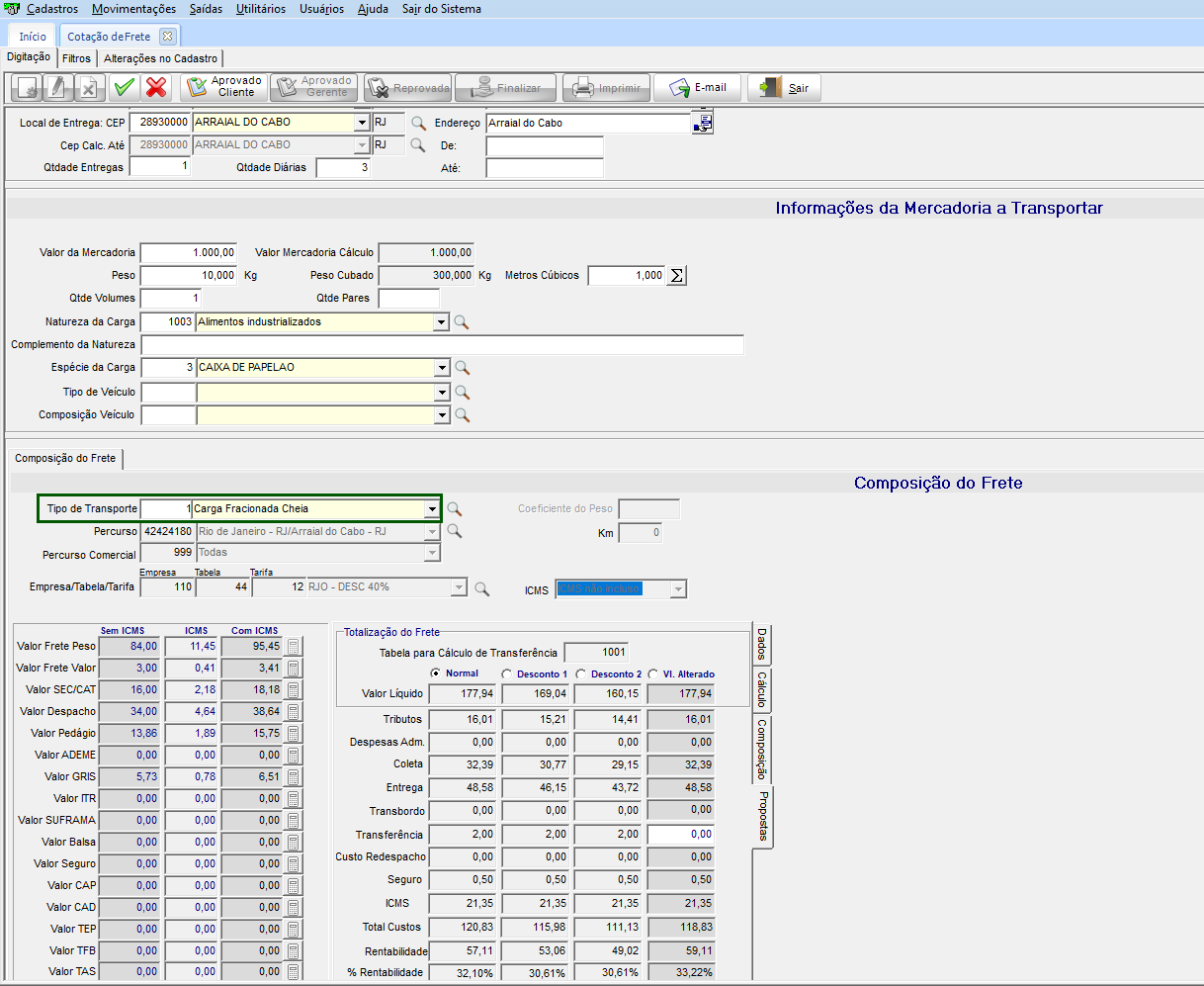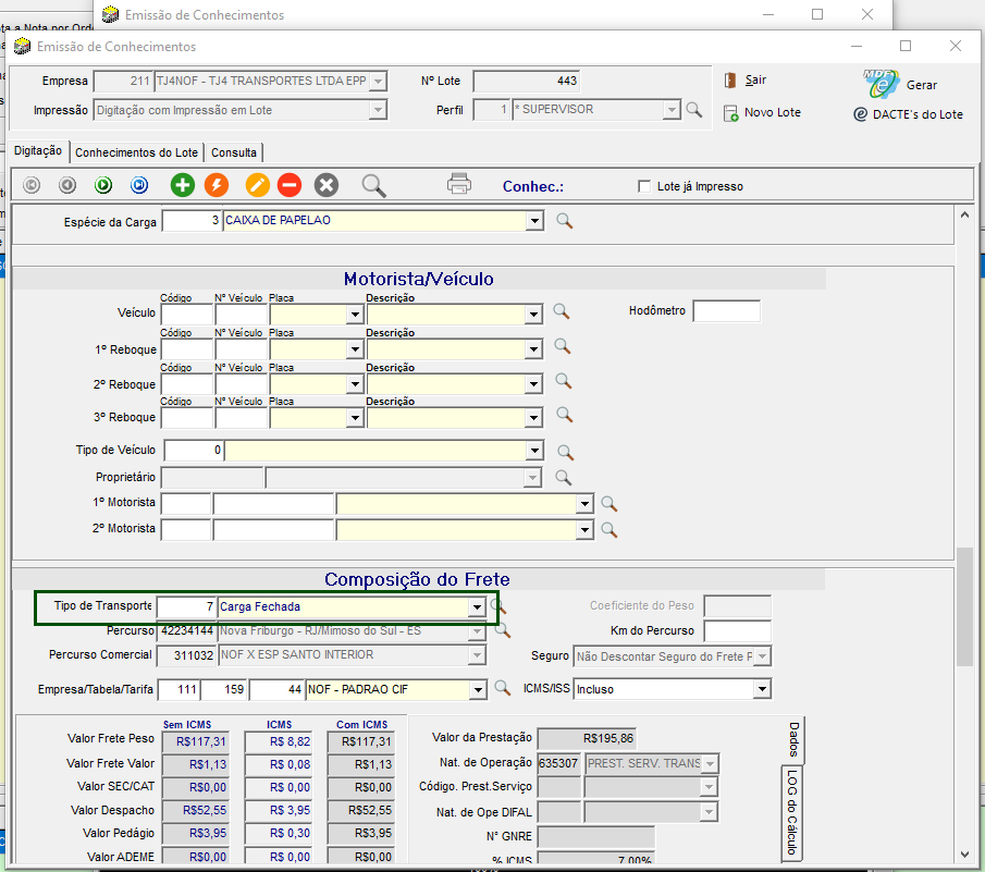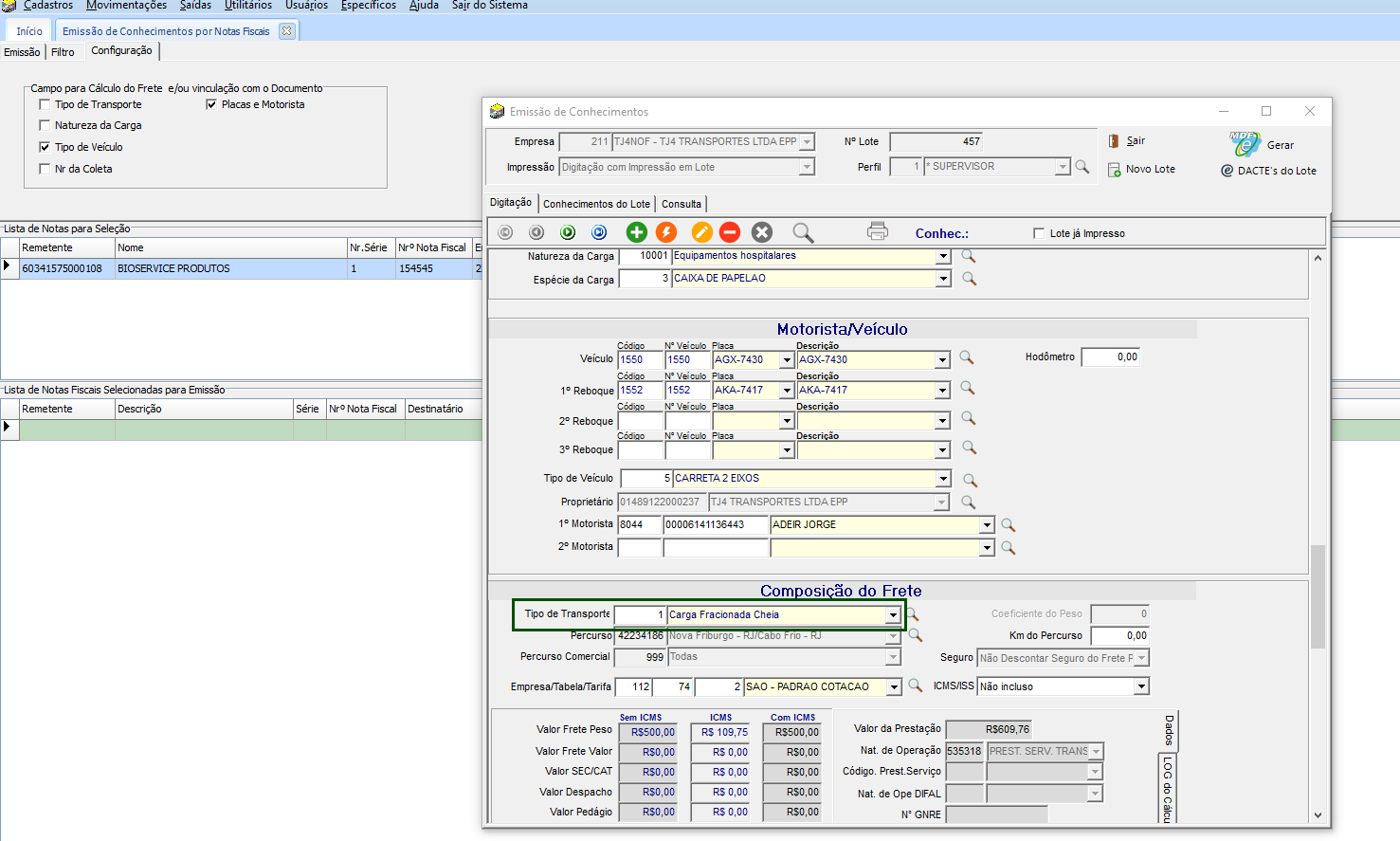 Buscar de forma automática o campo tipo de transporte na emissão do conhecimento, conforme cadastrado na vinculação, para que no momento da geração da fatura também busque os dados do centro de custo correto, para que a distribuição dos valores fique da forma correta (seja pela tabela de frete, quanto aos dados financeiros).