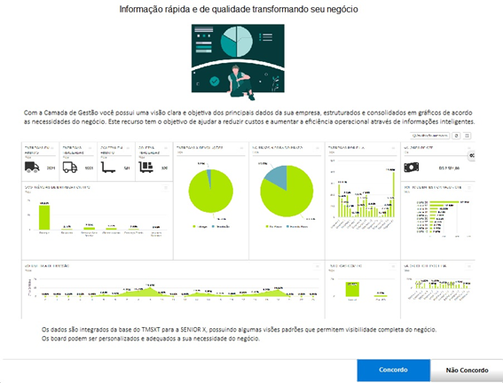 A camada de gestão deve ser essencial ao TMSXT, desta forma, assim que houver a instalação precisa ser habilitado. Com isso será apresentado uma tela com as principais informações onde o usuário irá concordar ou não de ter o acesso.