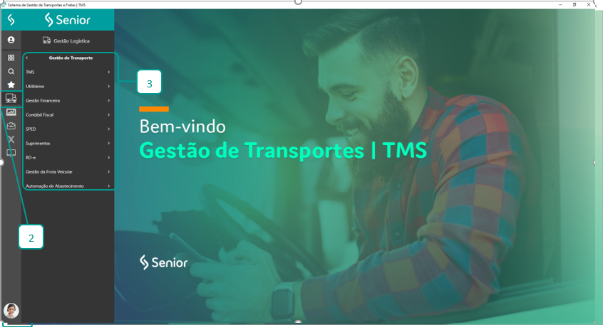 As rotinas de acesso aos produtos TMS estão disponíveis para acesso através da Barra Lateral (1) do menu principal, clicando no ícone relativo à Gestão Logística (2). Através deste menu, acesse a opção Gestão de Transporte. O menu irá disponibilizar todos os módulos e opções que o usuário logado tem acesso (3).