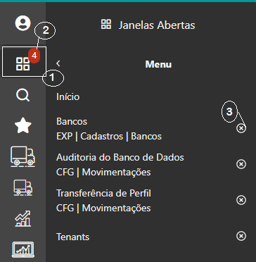 Através da opção de Janelas Abertas (1), no menu da barra lateral é possível controlar todos os menus das rotinas, bem como verificar a quantidade de Janelas Abertas (2) no momento. Onde, é possível fechar a janela diretamente no menu sem precisar chamá-la novamente, clicando diretamente no botão x (3).