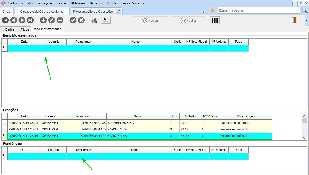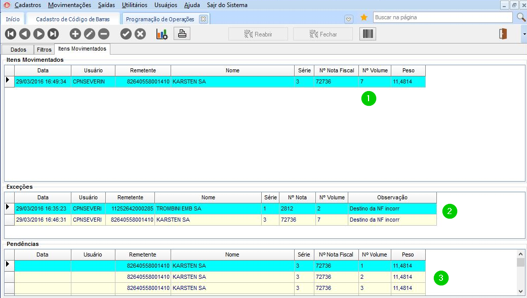 No COD, na aba “Itens Movimentados” os detalhes dos itens (1), a exceções que aconteceram na leitura feito pelo coletor (2) e as pendências (3).