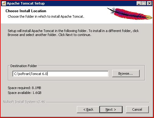 Alterar o “Destination Folder” para “C:\softran \tomcat 6.0” e clicar em Next.