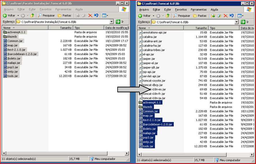 Na pasta de instalação “C:\softran\Pacote Instalação\” ir na pasta “Tomcat 6.0\lib”, copiar os arquivos para a pasta “C:\softran\Tomcat 6.0\lib”.