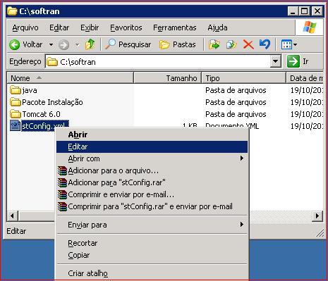 Na pasta “C:\softran”, clicar com o botão direto do mouse em “st C onfig.xml” e clicar em “Editar”.