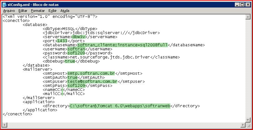 Ao clicar em editar, irá abrir o arquivo XML de configuração, onde deve ser configurado o servidor de banco de dados e de e-mail.