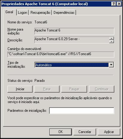 , que são utilizados para “Iniciar ”, “Parar”, “Pausar” ou “Reiniciar” o tomcat quando necessário.