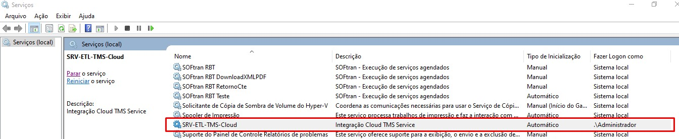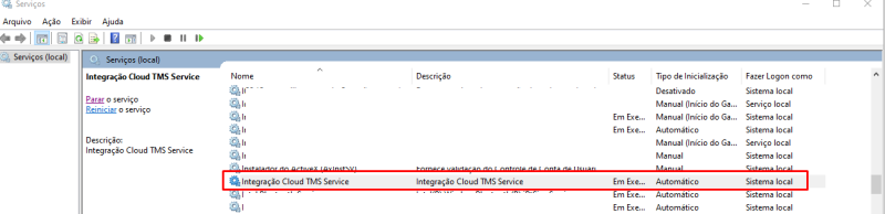 Na tela de Serviços, apresenta a coluna como a forma que será feito o logon (o usuário informado)