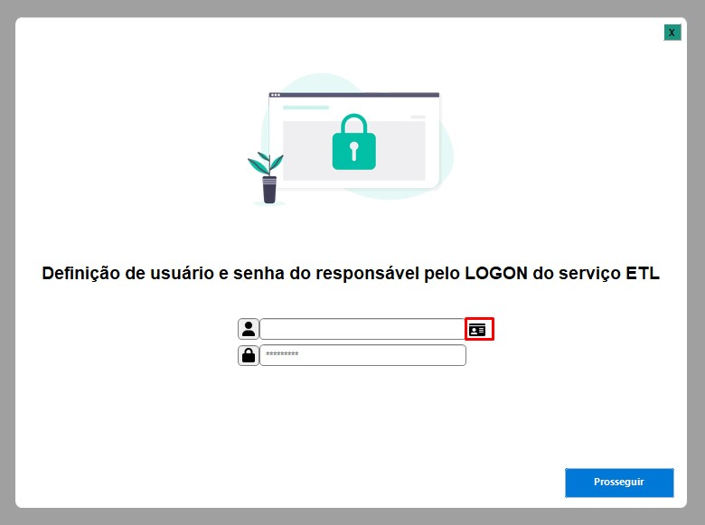 - Após a instalação do serviço é apresenta a tela para definir o usuário e senha. Clicando no ícone, abre a tela de usuários do Windows para selecionar.