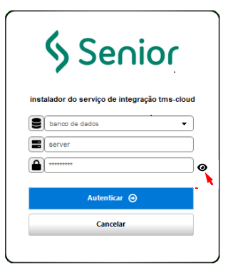 - Após selecionada a opção o executável irá apresentar a seguinte tela, o qual deverá ser informado o Banco de dados, Server e a Senha (podendo visualizar) para efetuar o login ao Banco de dados: