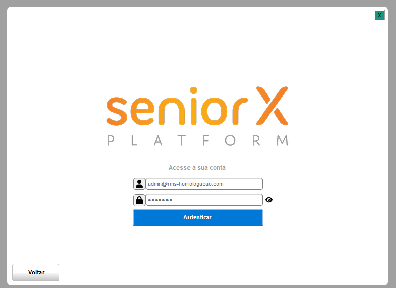 Assim será apresentada a tela para logar na conta cadastrada na plataforma Senior X