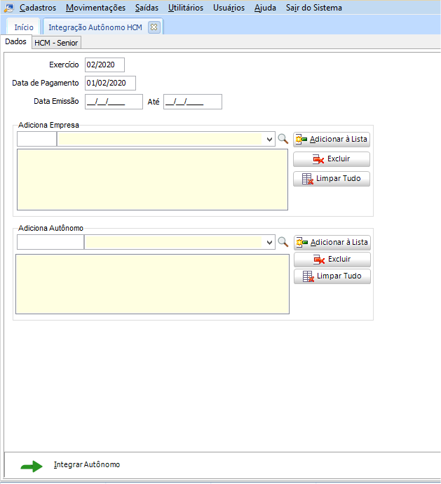 Na guia dados para otimizar a integração, pode ser adicionada a empresa e o autônomo, assim integrando somente os dados da empresa e autônomo informado. Se não for informado nenhum dado, serão considerados todas as empresas e todos os autônomos.
