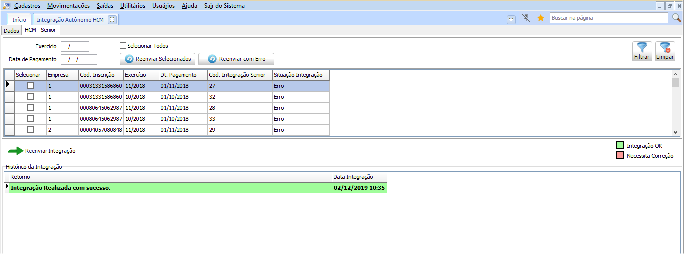 Ainda na guia HCM-Senior é possível reenviar as integrações que apresentaram erro.
