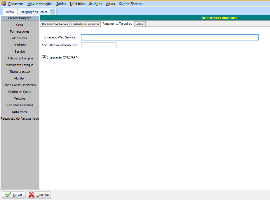 Assim que marcada a opção, a guia Pagamento Terceiros será apresentada e deverá ser informado o endereço do Web Service e o Código do Motivo Isenção IRRF para que a integração do pagamento de terceiro do Senior Logistíca ocorra corretamente com o Gestão de Pessoas | HCM