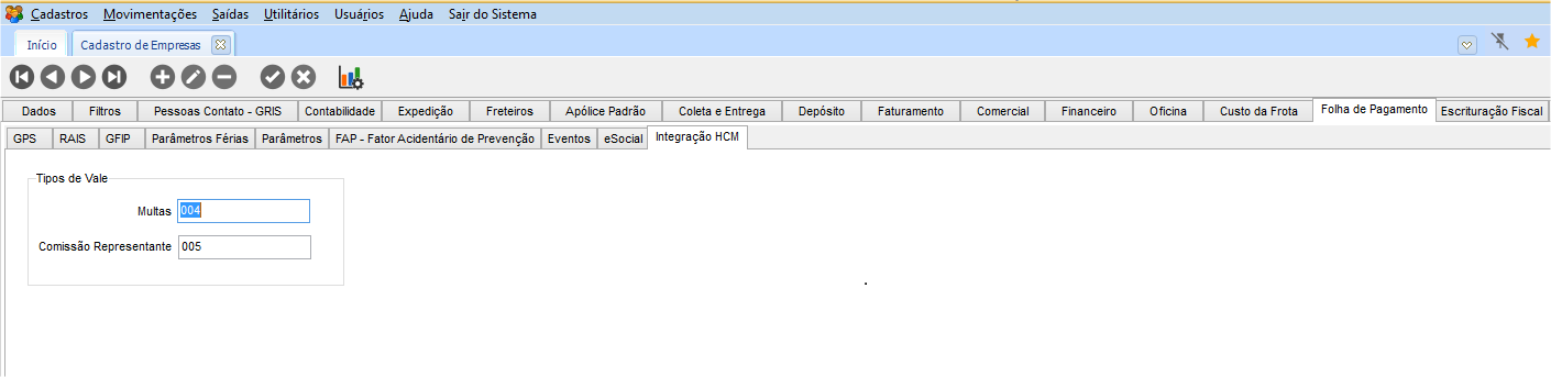 Na guia Integração HCM informar o tipo de vale (cadastrado no Gestão de Pessoas | HCM):