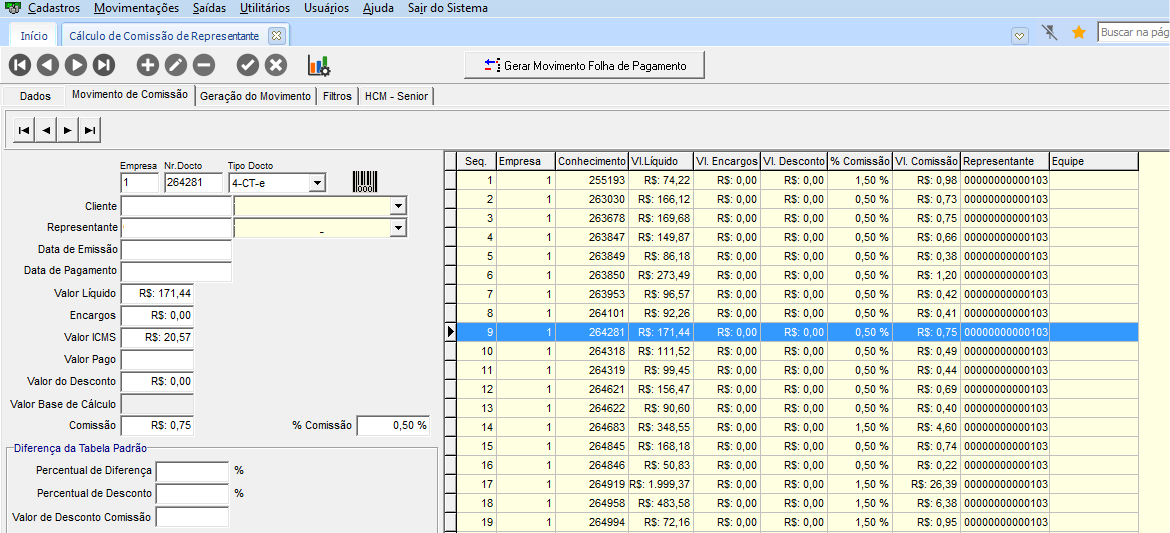 No módulo COM - Comercial | TMS, em Movimentações > Representantes > Cálculo de Comissão Modelo 2, ao Gerar Movimento Folha de Pagamento será integrado com o Gestão de Pessoas | HCM o valor da comissão do representante gerado no Senior Logística.
