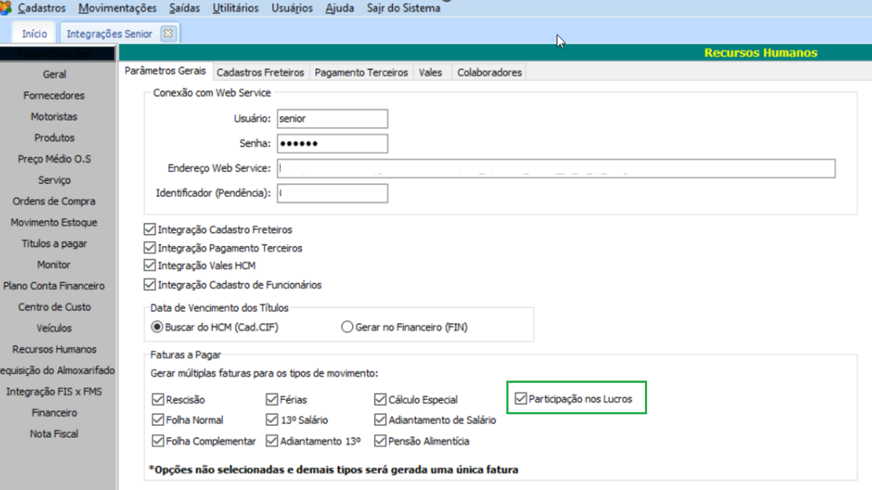 Em CFG > Cadastros > Utilitários > Integrações Senior, nas configurações do Recursos Humanos, na guia Parâmetros Gerais, é necessário marcar a opção Participação nos Lucros no grupo das Faturas a Pagar.