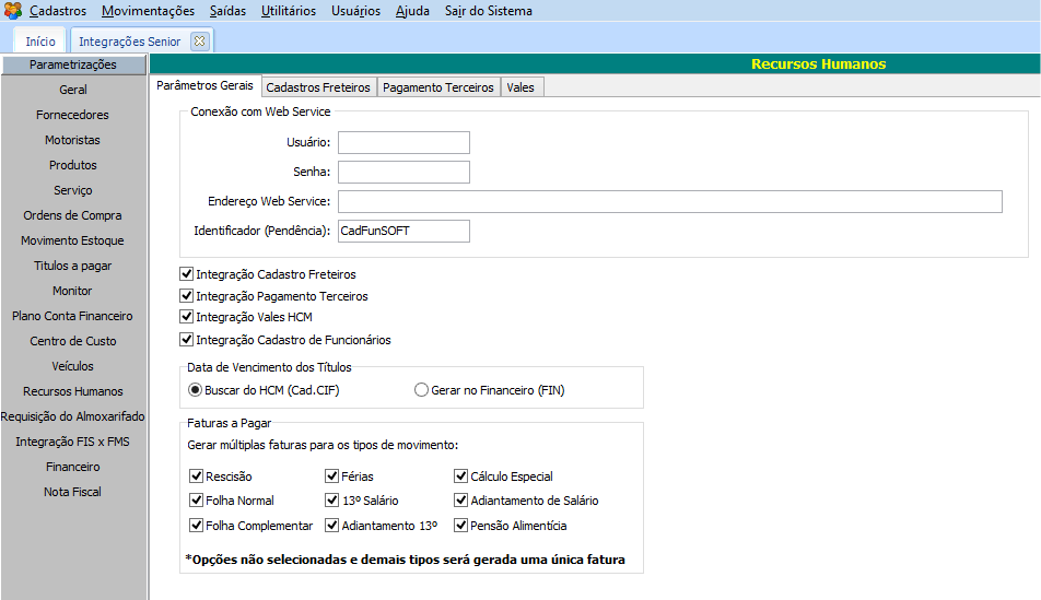No módulo de FIN | TMS em Utilitários > Integração RH Senior é possível integrar as movimentações da folha ou impostos da folha. Sendo assim, todas as guias e faturas da folha são geradas após o fechamento. Então, o usuário pode acessar o módulo FIN e escolher o lote/período e gerar as faturas normalmente.