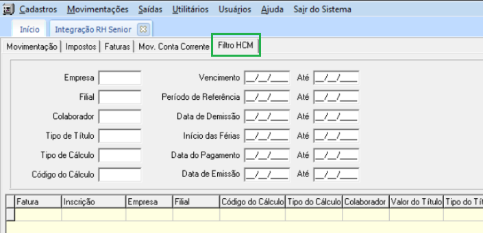 É possível pesquisar as faturas integradas através da guia Filtro HCM: