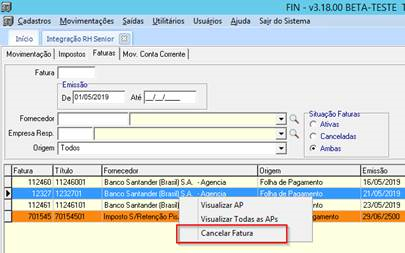 Para reimportar os registros, a fatura precisa ser cancelada através da tela de Integração no módulo FIN em Utilitários > Integração RH-Senior > guia Faturas