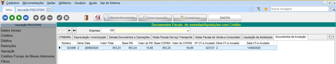 - Quando a opção Integrar estorno de Documentos de CTe de Substituição (Créditos) estiver desmarcada na Apuração do PIS/COFINS do período, os créditos dos Conhecimentos Substitutos não serão apurados. Desta forma, na guia Documentos Substituição dos Créditos do Documentos de Anulação/Substituição, os CT-es substitutos do período não serão listados.