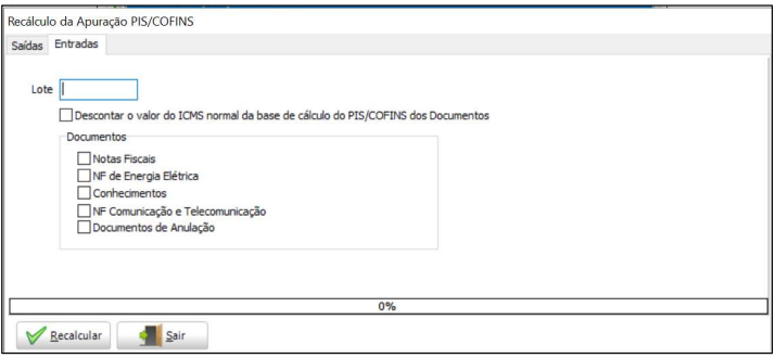 Em CTB > Utilitários > Recálculo da Apuração de PIS/COFINS, é possível realizar o recálculo para as Saídas e para as Entradas.