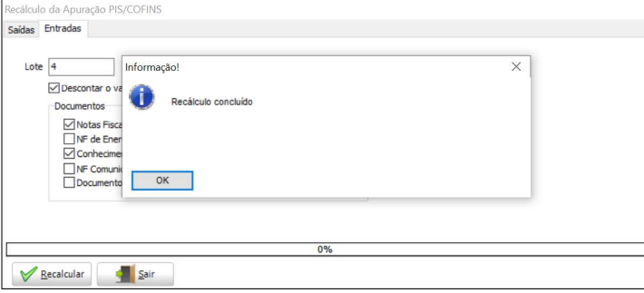 Depois de finalizado o recálculo, será gerada a Apuração de PIS/COFINS automaticamente e atualizando a apuração.