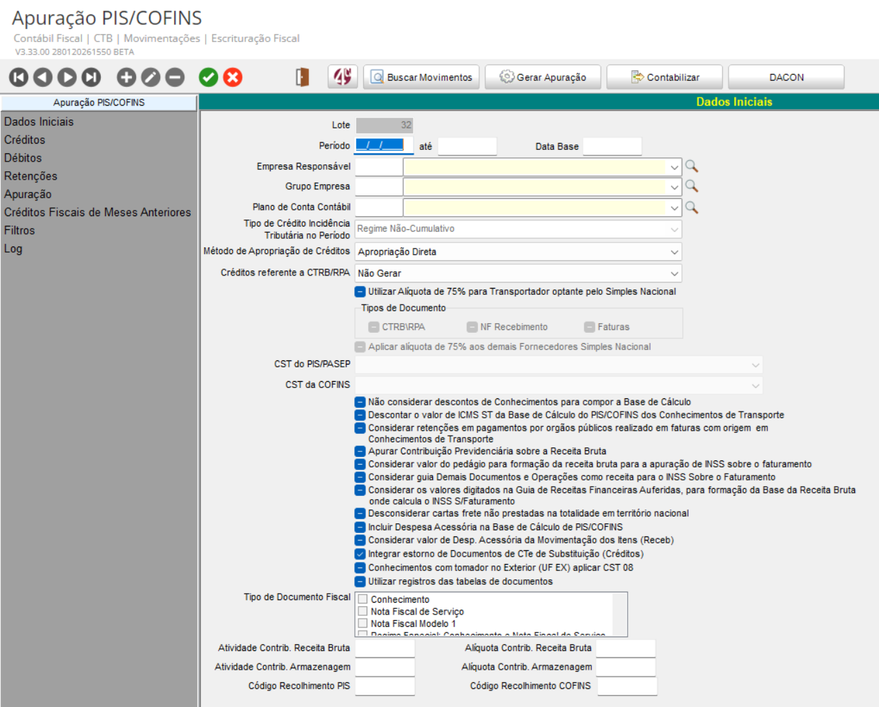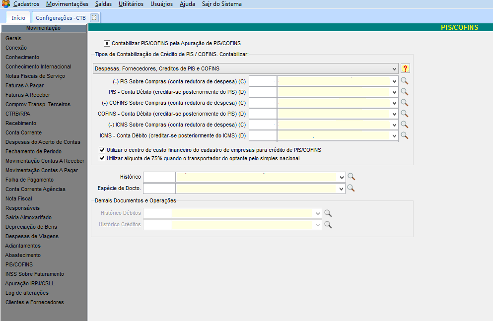 O sistema move automaticamente para todos os documentos o CST PIS/COFINS:“50 -Operação com Direito a Crédito -Vinculada Exclusivamente a Receita Tributada no Mercado Interno” e a Natureza da Base de Cálculo “14 -Atividade de Transporte de Cargas -Subcontratação” - Depreciação/Amortização: notas de bens de patrimônio da empresa.