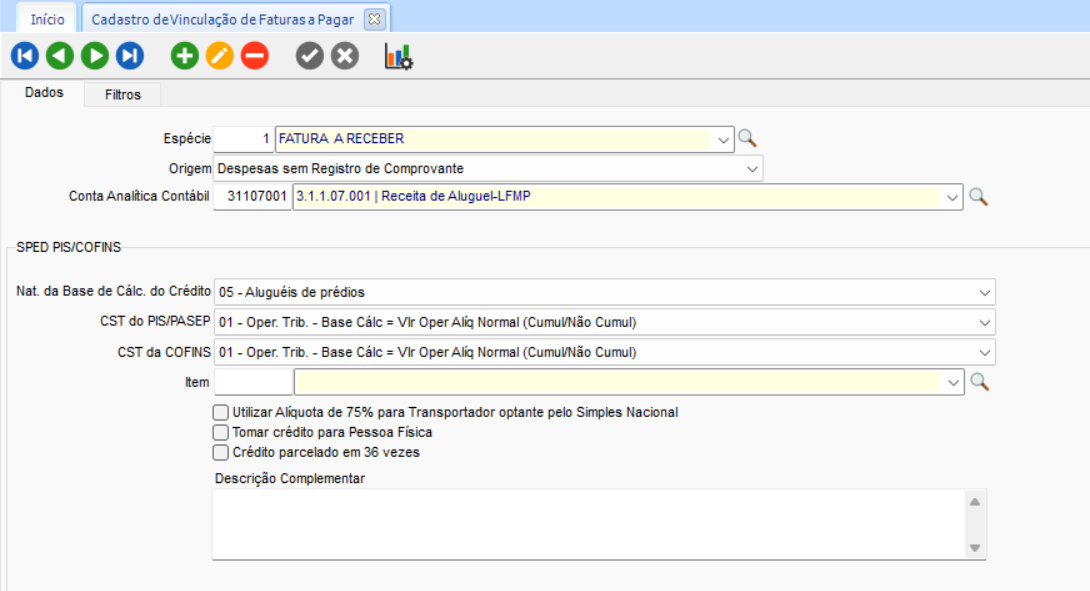 No módulo CTB em Cadastros > Escrituração Fiscal > Apuração PIS/COFINS > Vinculação de Faturas a Pagar, para que as faturas com origem Receita sem Registro de Comprovante sejam apuradas e apresentadas na guia Demais Documentos nos Débitos da Apuração, deverá ser realizada a vinculação da espécie do título com a conta analítica contábil. Dica: são as mesmas informações utilizadas no cadastro da fatura.