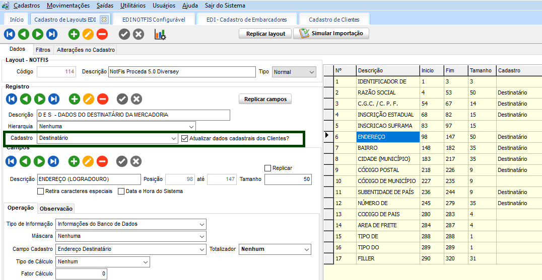 Em Cadastros > Layout EDI Configurável > Importação, para o layout NOTFIS nas opções de registro de Destinatário, marque a configuração Criar novos endereços de Coleta/Entrega.