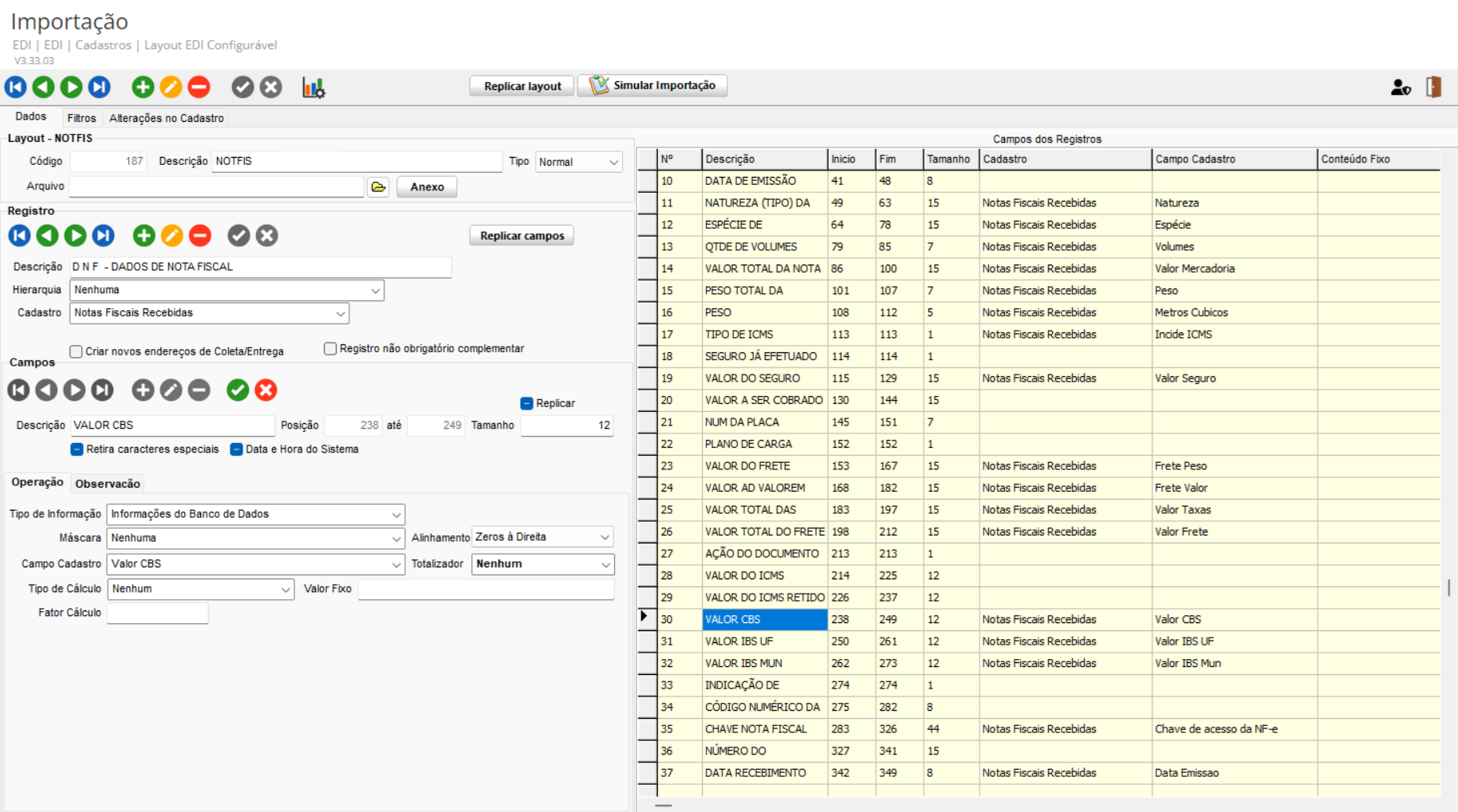 - Importação: será cadastrado o leiaute para NOTFIS.