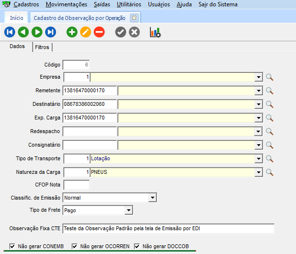 Na tela de Cadastro de Observação de Operação, definido a condição para gerar o CTe, porém marcada as opções para não gerar os registros no EDI.