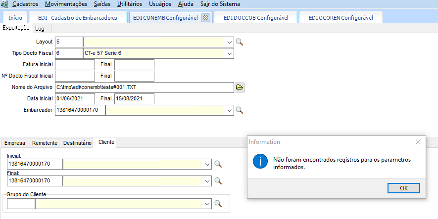 Em Utilitários > EDI CONEMB Configurável, ao gerar o arquivo, será apresentado a mensagem: