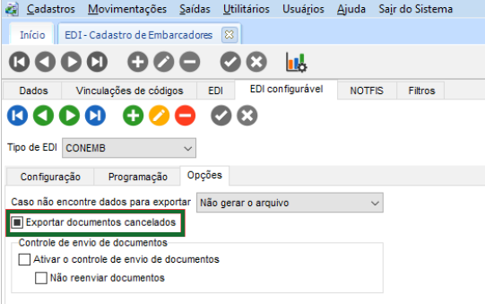 Para não gerar os registros de EDI quando a opção estiver desmarcada no Cadastro de Tipo de Transporte, e a configuração geral do módulo estiver marcada, o sistema não permite gerar os dados de EDI, apresentando mensagem ao usuário.