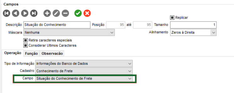 Neste quadro também é possível informar no campo Campo como Situação do Conhecimentoquando o tipo for Conhecimento de Frete para visualização da exportação de EDI incluindo a situação dos registros de CT-e que foram cancelados, onde os ajustes necessários estarão disponíveis a serem configurados na guia Função. Para isto utilize o EDI em versão 3.22.00 ou superior. Sendo assim, para que seja utilizado essa opção é necessário que no menu EDI – Cadastro de Embarcadores a configuração de Exportar Documentos Cancelados esteja habilitada.