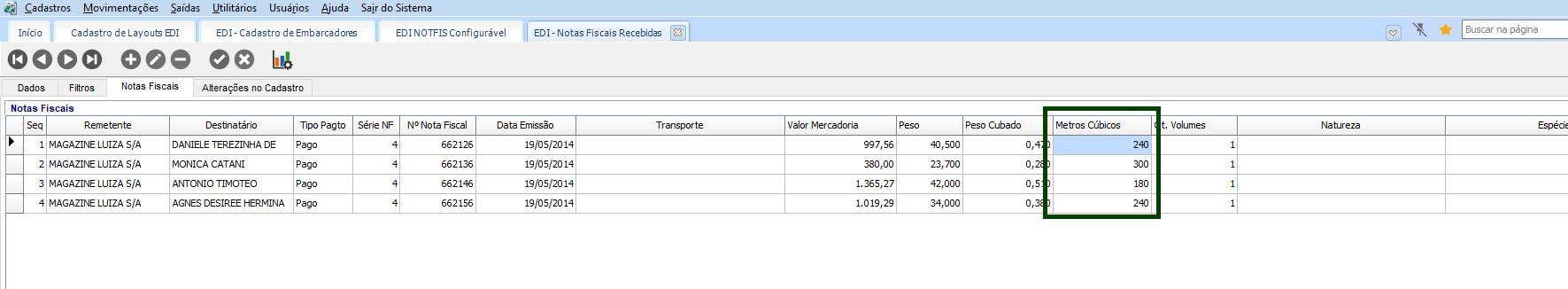 Em Movimentações > EDI > Notas Fiscais Recebidas possível verificar os valores de metros cúbicos:
