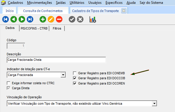 No módulo CFG, em Utilitários > Configurações > TMS > EDI – Intercâmbio Eletrônico de Dados, na opção EDI Configurável, fica a configuração: Utilizar configuração do Cadastro de Tipo de Transporte para a Geração dos Registros EDI (Conemb, DOCCOB, OCORREN):