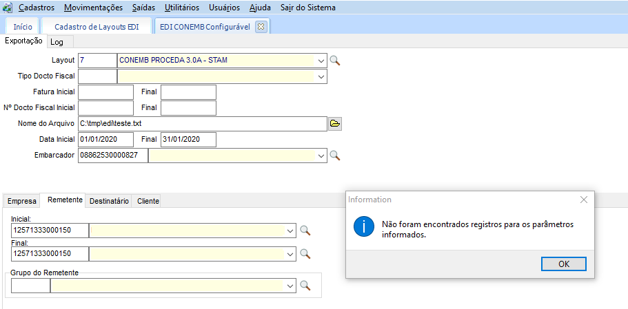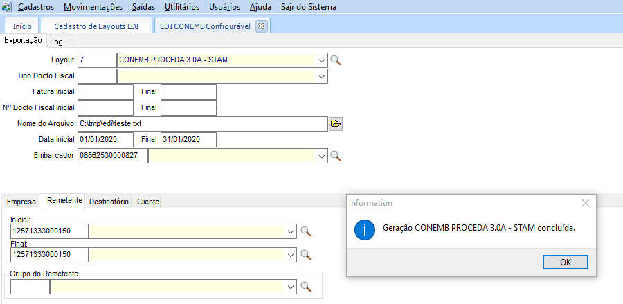 Marcada a configuração no cadastro de leiautes. Em Utilitários > EDI CONEMB Configurável, gerar o arquivo para um período, selecionando o mesmo layout configurado anteriormente.