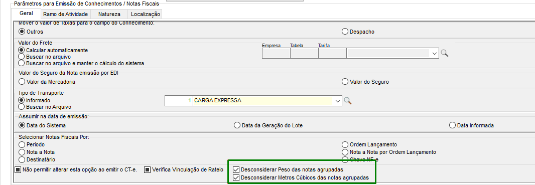 Quando a configuração estiver marcada, ao importar o arquivo deste embarcador, o peso e metragem cúbica das notas fiscais agrupadas serão desconsideradas, ou seja, será importado o peso e metro cúbico apenas da primeira nota fiscal que for agrupada.